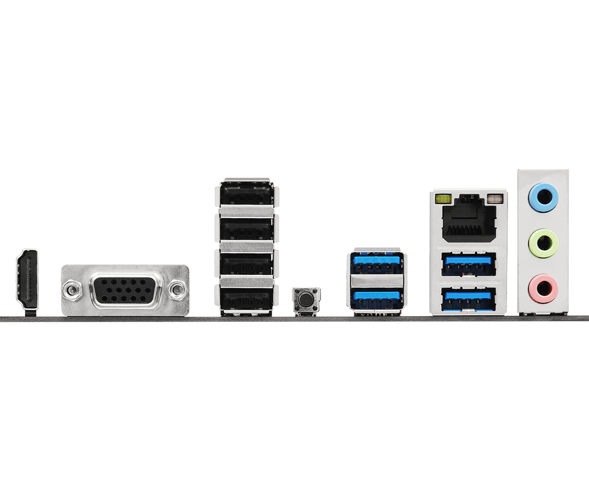 | Blende | - 2 x Antennenmontagepunkte - 1 x D-Sub Port - 1 x HDMI Port - 4 x USB 3.2 Gen1 Type-A Ports - 4 x USB 2.0 Ports - 1 x RJ-45 LAN Port - 1 x BIOS Flashback Button - HD Audio Jacks: Line in / Front Speaker / Microphone |