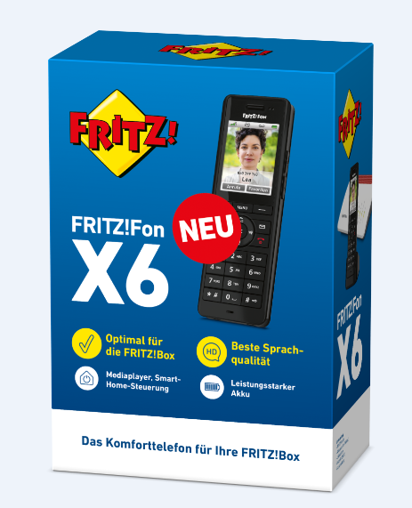 | Lieferumfang | - FRITZ!Fon X6 - Ladestation - Netzteil zum Anschluss an das 230-Volt-Stromnetz - Li-ion-Akku - Kurzanleitung |