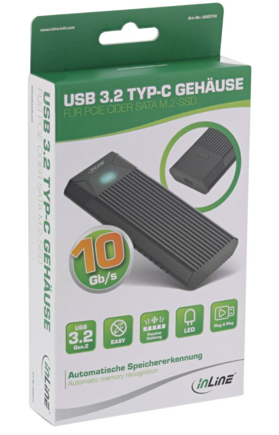 Bezeichnung | InLine® USB3.2 Gen.2 USB-Typ C zu M.2 SSD (PCIe NVMe & SATA) Gehäuse |