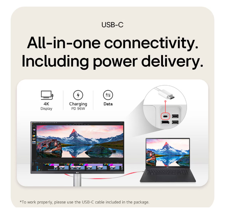 Merkmale | - 27 Zoll UHD 4K IPS-Display - DCI-P3 95 % (Typ.) - VESA DisplayHDR™ 400 - USB-C - Neigbarer, höhenverstellbarer und drehbarer Standfuß |
