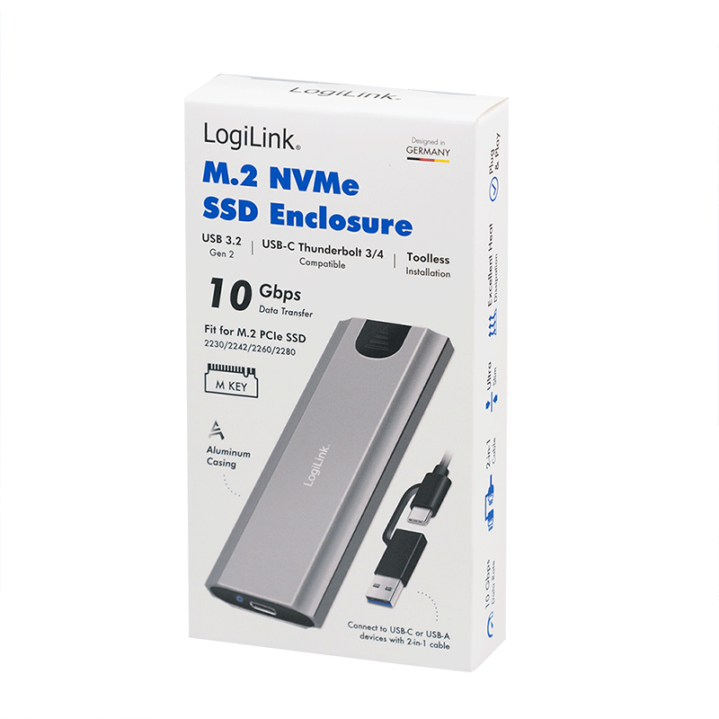 Merkmale | - Geeignet für M.2 NVMe (PCIe) 2230/ 2242/ 2260/ 2280 SATA SSDs - USB 3.2, Gen 2, Übertragungsrate: Bis zu 10 GBit/s - Anschlüsse: 1x USB-A-/USB-C-Stecker - Unterstützt SSD-Kapazität: Max. 10 TB - Unterstützter SSD-Typ: M-Key NVMe M.2 SSD (PCIe) - Geräteschutz: Überstrom, Überladung, Überentladung, Überlast, Überhitzung und Kurzschluss - LED-Anzeige: Blaue LED für Arbeitsstatus - Kompatibilität: Windows, MacOS, iPadOS, iOS, Linux, Android und Chrome OS - Farbe: Silber - Gewicht: 0.048 kg - Höhe: 1.65 cm - Breite: 3.94 cm - Länge: 10.45 cm |