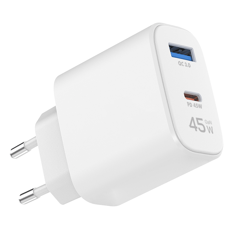| Bezeichnung | Dual-USB-Steckdosenadapter, 45 W, GaN, 1x USB-A, 1x USB-C, weiß |