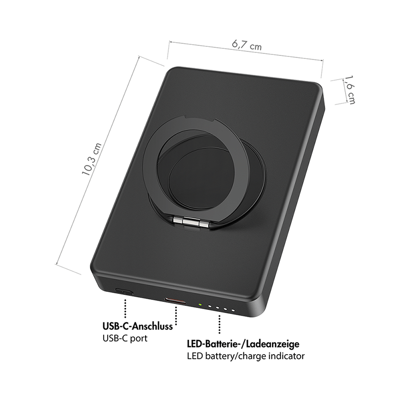 | Bezeichnung | Powerbank 10.000 mAh, USB-C + kabelloses Laden, 20 W, mit Aufsteller, 3,7 Li-Po, schwarz |