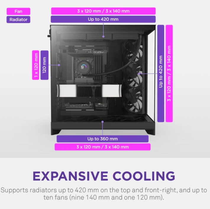 | Beschreibung | Das H9 Flow ist ein geräumiges Mid-Tower-ATX-Gehäuse, das für Hochleistungs-Builds entwickelt wurde und Luftstrom und Ästhetik ausbalanciert. Sein Dual-Kammer-Design verbessert die Kühlung und das Kabelmanagement, während perforierte Paneele, angewinkelte Lüfter und reichlich Lüfter- und Radiatorunterstützung optimale thermische Leistung bieten. Dual-Kammer-Design: Trennt die Hauptkomponenten vom Netzteil und den Laufwerken für verbesserte thermische Leistung und Kabelmanagement. Optimierter Luftstrom: Perforierte Stahlplatten und angewinkelte Lüfter an der Vorderseite rechts sorgen für effiziente Kühlung bei Hochleistungsaufbauten. Vorgefertigte Lüfter: Beinhaltet drei F140Q (CV) Lüfter an der Vorderseite rechts und einen F120Q (CV) Lüfter hinten. CV = Gehäuseversion (3-polig DC) Zehn-Lüfter-Kapazität: Unterstützt bis zu neun 140mm Lüfter oben, vorne rechts und unten, plus einen 120mm Lüfter hinten. Panoramablick: Präsentieren Sie jedes Detail Ihres Aufbaus mit nahtloser, umlaufender gehärteter Glasverkleidung. Große Radiatoren & GPUs: Passt zu einem 420mm Radiator oben und vorne rechts, mit viel Platz für High-End-Grafikkarten. Einfaches Kabelmanagement: Extra-breite Kanäle, eingebaute Klettverschlüsse und Befestigungspunkte machen die Kabelverlegung mühelos. Rückverbindungsbereit: Kompatibel mit rückverbindenden Motherboards wie ASUS BTF und MSI Project Zero für ein kabelloses Aussehen. |
