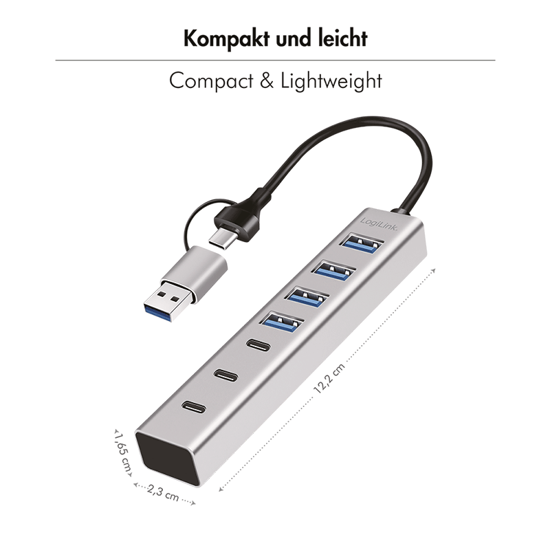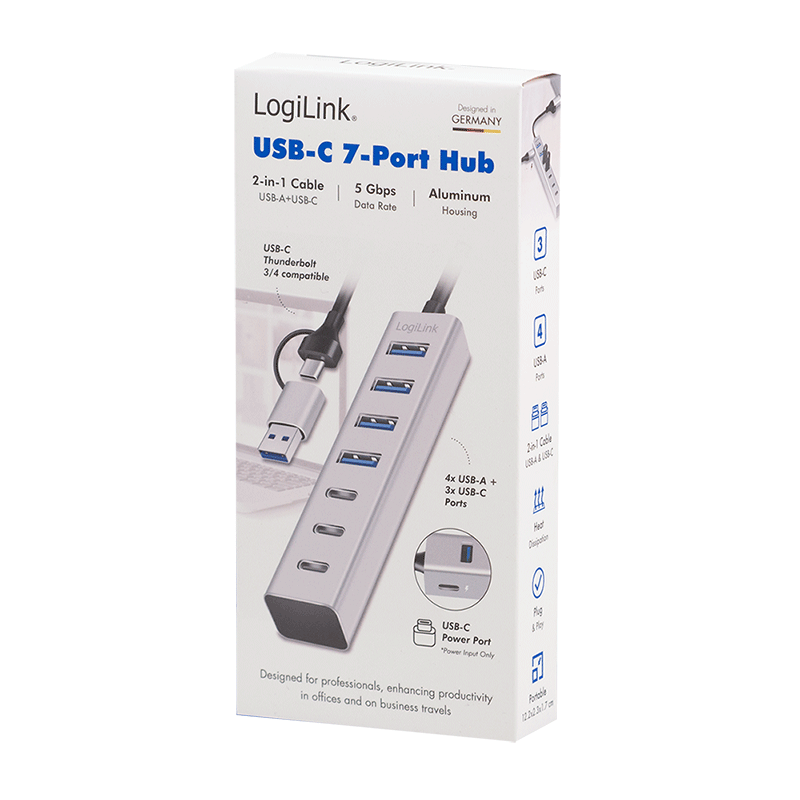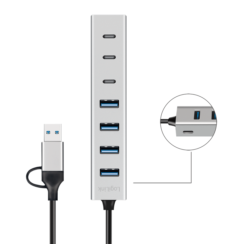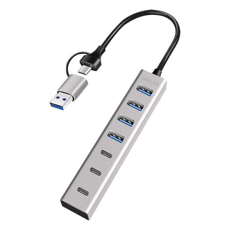 | Bezeichnung | USB 3.0 Hub, 7-Ports, 4x USB-A, 3x USB-C, 2-in-1 Anschlusskabel, 5 Gbit/s, Silber |